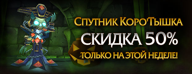 В честь Тыквовина из могильных глубин магазина Blizzard восстал питомец-нежить Коро’Тышка. После долгого пребывания в склепе цена его слегка выцвела и составляет на этой неделе всего 5 € — на 50% дешевле, чем обычно! Прекрасная возможность пополнить свою коллекцию питомцев или порадовать товарищей по гильдии (если они ходят за вами по пятам и требуют подарков на Тыквовин). Это крохотное подобие верховного лича — дикое, но симпатичное — не уймется, пока не переморозит всех окрестных зверушек.